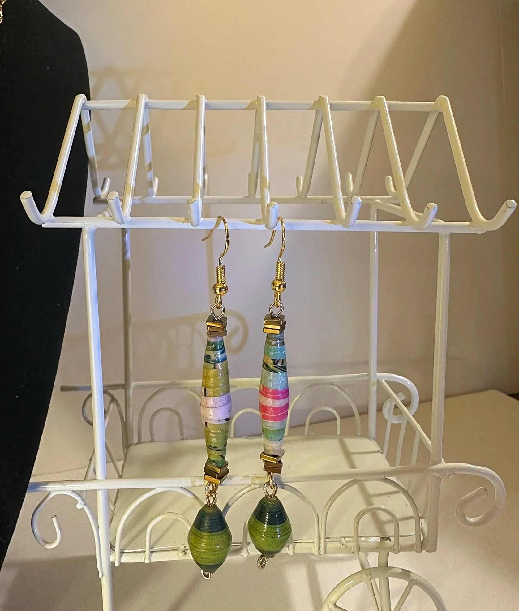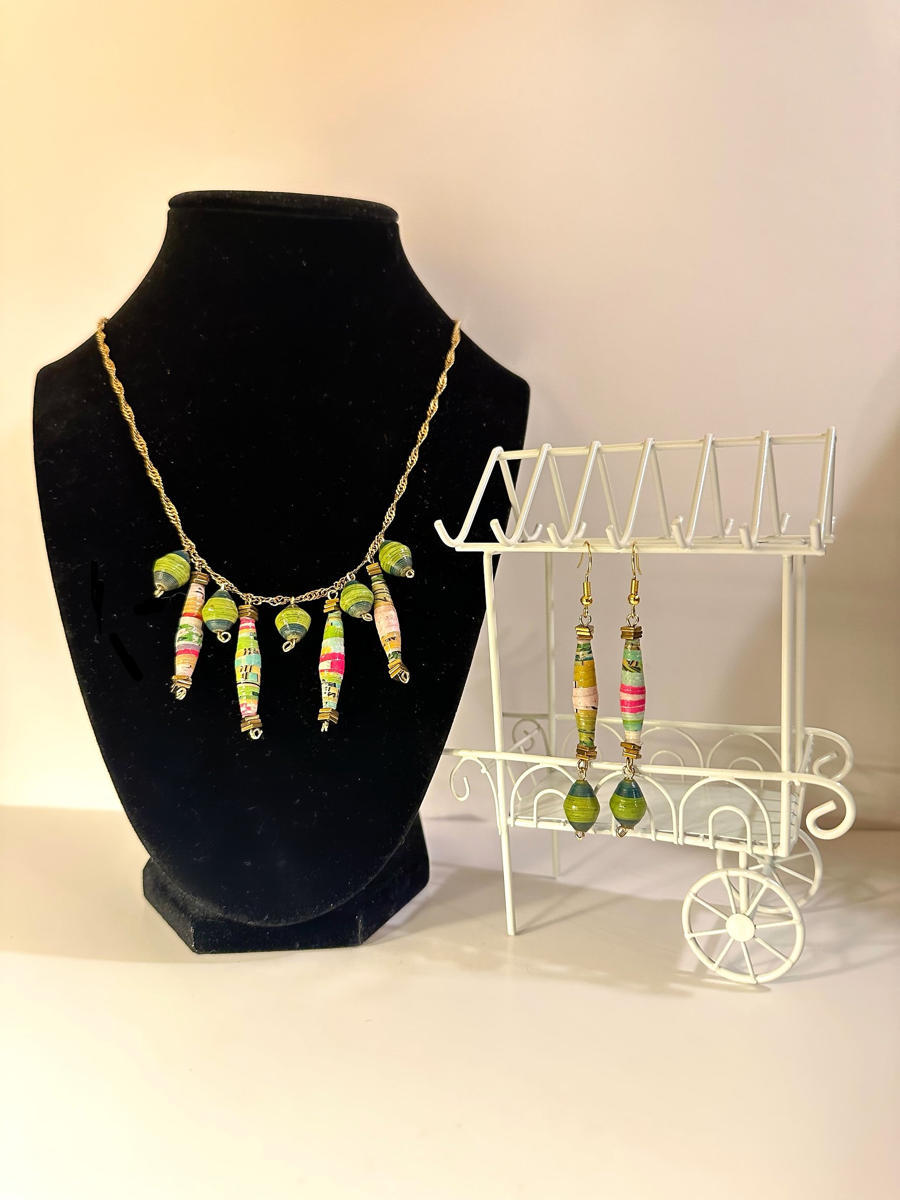 A unique gold set of earrings and a necklace, made with colorful long paper wrapped beads, and separated with light and dark green paper wrapped beads!